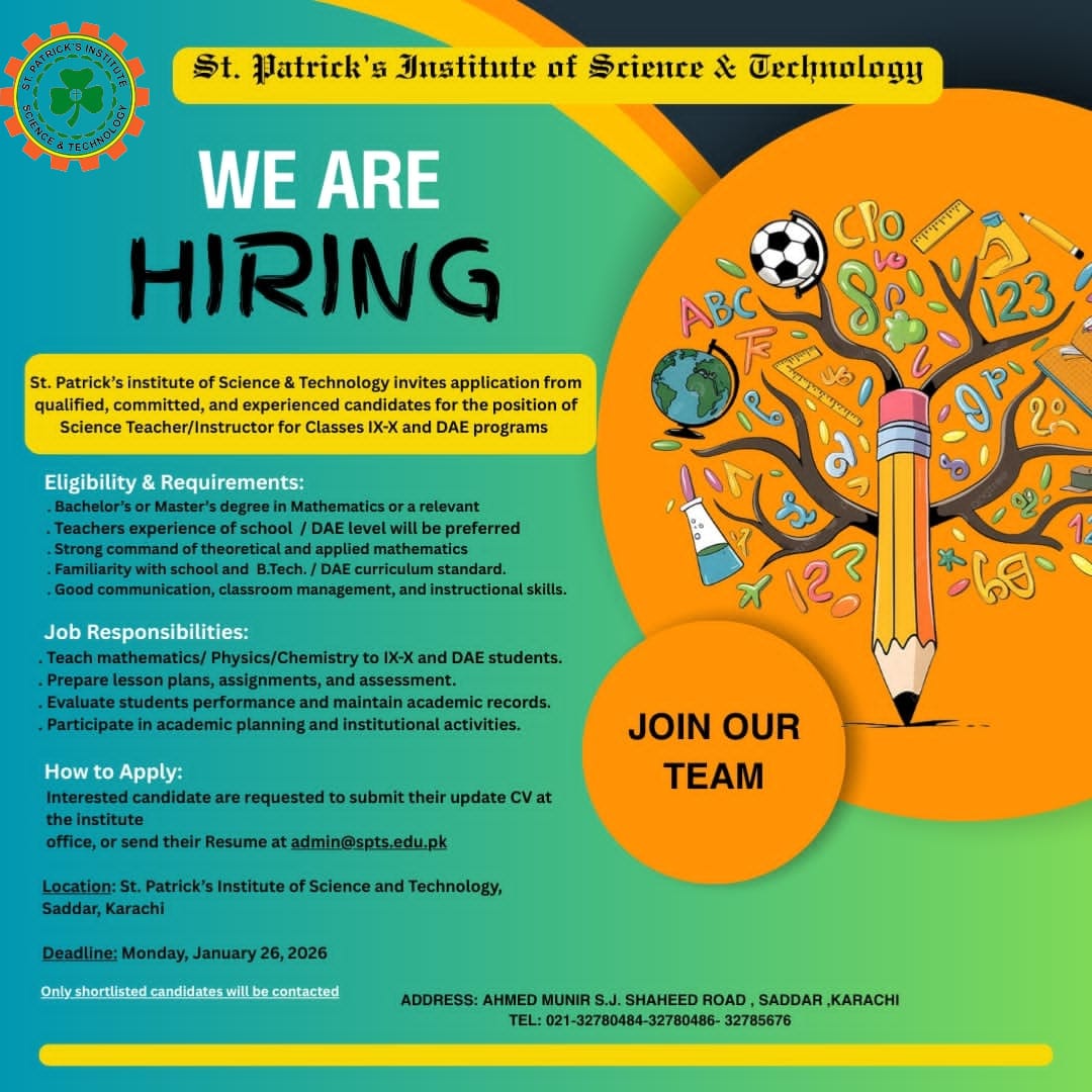 St. Patrick’s Institute of Science & Technology invites applicatation from qualified, committed, and experienced candidates for the position of Science Teacher/Instructor for classes IX-X and DAE Programs.
